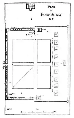 For officers' quarters there are nine detached frame buildings, built of pine, on brick foundations, with collars underneath. Each set has a back building of one story, as a kitchen. All the rooms are lathed and plastered. Three of the houses are one and a half stories high, and contain each four rooms, a hall, store-room, and pantry. Two cottages are of one story, while two others, of one and a half stories, are divided each into two sets of quarters of four rooms. None of these quarters have bath-rooms. The guard and prison-rooms are in the ends of the barrack building next the sally-port. The prisoners' room is 15 by 15 feet (4.6 m). The quartermaster's store-houses, two in number, measure 230 by 22 feet (6.7 m) and 120 by 24 feet (7.3 m). The commissary's store-houses, also two in number, measure 228 by 17 feet (5.2 m) and 50 by 22 feet (6.7 m).[9]