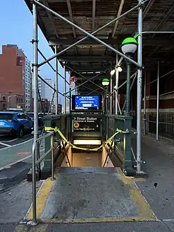 At the extreme south end of both platforms, staircases lead up to exit/entrance areas at street level.[46]: 5  The exit/entrance area on the Manhattan-bound (eastern) side of the station was closed for around 40 years before being reopened in February 2012.[49] On each side, staircases go up to either of the IND platforms at Fourth Avenue.[46]: 5