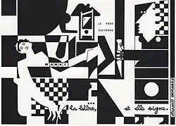 In 1981, Francis Bernard creates a graphic series based on the character Père Duchesne. This will be shown for two months at the Centre Pompidou in Paris.[2] The series is a collection of 150 drawings and paintings and constitutes the « Théâtre pictural du Père Duchesne ». It is inspired by the Jean-Pierre Faye play, Les dernières journées du père Duchesne, which uses historical material from the revolutionary newspaper Le Père Duchesne. Twenty two panels of this series are also presented at the French-Italian Cultural Center, during the biennial Venice carnival on the theme "The masks of Marat".