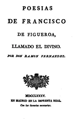 Francisco de Figueroa (c. 1530[1] – c. 1588) was a Spanish poet best known for his love sonnets and his bilingual compositions in Spanish and Italian. Born in Alcalá de Henares,[2] Figueroa spent his early years in Alcala, studying under Spanish humanist Ambrosio Morales, and traveled to Italy at an early age (he was at in Siena in 1552).[3]