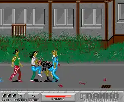 The game proper begins somewhere in the early 1990s - with slight hints in the form of references like C+C Music Factory being mentioned on a floor graffiti[6] and one billboard in the third level depicting an advertisement for RoboCop 3. The protagonist - who could be either Franko or Alex despite the latter supposed to be deceased - roams through the streets of Szczecin based on actual locations, starting first at the Rydla street of Osiedle Słoneczne neighbourhood, then going through Independence Alley[7] with the final level being set on the Drzetowo-Grabowo neighbourhood.[8] On his way Franko (or Alex) beats up droves of punks, thugs, karatekas, police officers, ZOMO troops, a software pirate (being the boss of the second stage), exhibitionists and others before finally getting on Klocek. After weakening Klocek, the drug boss wants to get some rest but he ends up breaking the railing behind him and falls onto the train tracks.