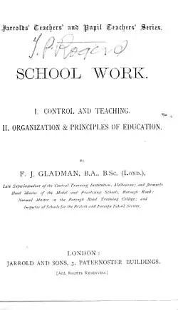 2. ^ School Work Control and Teaching Organisation and Principles of Education by F. J. Gladman published Jarrold and sons 1886