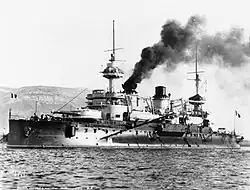 During exercises off Golfe-Juan on 31 January 1903, Gaulois accidentally rammed Bouvet. The latter was barely damaged, but Gaulois lost two armour plates from her bow; both captains were relieved of their commands.[12] Captain (Capitaine de vaisseau) Pierre Le Bris assumed command of Gaulois on 20 March.[13] In April 1904, she was one of the ships that escorted Loubet during his state visit to Italy. Later that year, the ship made port visits in Thessaloniki and Athens, Greece, with the rest of the Mediterranean Squadron. A wireless telegraph was installed aboard Gaulois in December 1905. Together with the battleships Iéna and Bouvet, the ship aided survivors of the April 1906 eruption of Mount Vesuvius in Naples, Italy. On 16 September she participated in an international naval review in Marseille, together with British, Spanish and Italian ships.[14]