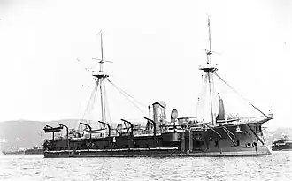 Her main battery consisted of four 240 mm (9.4 in) M1870, 19-caliber guns mounted in individual barbette mounts, two forward placed abreast, and two aft, both of the latter on the centerline. She carried a 194 mm (7.6 in) 19,8-cal. M1870 gun in the bow as a chase gun. These guns were supported by a secondary battery of six 138.6 mm (5.46 in) 21.3-cal. M1870 guns carried in a central battery located amidships in the hull, three guns per broadside. For defense against torpedo boats, she carried twelve 37 mm (1.5 in) 1-pounder Hotchkiss revolver cannon, all in individual mounts. Her armament was rounded out with two 356 mm (14 in) torpedo tubes in above-water launchers forward of the central battery. She also carried a pair of 65 mm (2.6 in) field guns that could be sent ashore with a landing party.[6][5] In 1889, the ship received a pair of 47 mm (1.9 in) guns in place of two of the 37 mm guns, and by 1893, a further four of the 47 mm guns were added.[5]