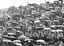 Spectators at the Friedrich-Ludwig-Jahn-Sportpark during a match between ASK Vorwärts Berlin and SC Leipzig on 12 April 1965.