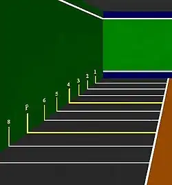 The lower zone line is 15 cm wide and the height depends on the size of the fronton (see chart). The upper zone is frequently marked at 10 m high on the wall and the line is also 15 cm wide.