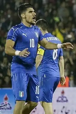 Gori recovered from knee surgery in time to be included in the Italian team for the 2011 FIFA Beach Soccer World Cup on home sand in Ravenna,[3] but suffered at the tournament with a fever.[6] At his next World Cup appearance in 2015, he scored his 100th goal for Italy during the semi-final defeat to Tahiti,[7] ending the tournament as its joint second top scorer.[8] Later that summer, he scored four of Italy's five goals in the gold medal match of the Mediterranean Beach Games versus Egypt,[3][9] securing Italy's first major honour for ten years.[10] After earning his 100th cap for Italy in September 2016,[11] Gori was then voted as one of the three best players in the world at that year's annual season-ending Beach Soccer Stars awards ceremony[12] and also won the Pallone Azzurro (Blue Ball) award for best Italian player of the year bestowed by the Italian Football Federation.[13] His biggest individual accolade came six months later at the 2017 World Cup, where he won the Golden Boot (top scorer) with 17 goals,[14] and his 12 goals during the 2018 EBSL season helped Italy secure their first European crown in 13 years, the biggest title of Gori's career.[10]