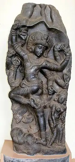 In sculpture, Gajasurasamhara is often pictured with eight or sixteen arms. These multiple arms are uncommon in Shiva's iconography and are exclusively used in his combative forms.[6] In such multiple-armed images, Shiva may carry various attributes like the trishula, a damaru, sword, kapala, pasha, deer, ankusha (goad), vajra (thunderbolt), arrow, gada (mace), khatavanga, tanka (a chisel-like weapon), bow, snake, the elephant's tusk and akshamala. His hands may be held in suchihasta mudra (gesture to draw or point out attention) or vismaya mudra. At least, two arms hold the elephant skin around the body.[13][14]