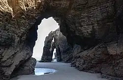The oldest attestation of human presence in Galicia has been found in the Eirós Cave, in the municipality of Triacastela, which has preserved animal remains and Neanderthal stone objects from the Middle Paleolithic. The earliest culture to have left significant architectural traces is the Megalithic culture, which expanded along the western European coasts during the Neolithic and Calcolithic eras. Thousands of Megalithic tumuli are distributed throughout the country, mostly along the coastal areas.[25] Within each tumulus is a stone burial chamber known locally as anta (dolmen), frequently preceded by a corridor. Galicia was later influenced by the Bell Beaker culture. Its rich mineral deposits of tin and gold led to the development of Bronze Age metallurgy, and the commerce of bronze and gold items all along the Atlantic coast of Western Europe. A shared elite culture evolved in this region during the Atlantic Bronze Age.