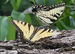 Pair of tiger swallowtails (Papilio glaucus) on logjam in the river.
