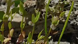 Galium bifolium is an annual herb standing erect to a maximum height of about 15 centimeters. Leaves grow in whorls of four divided into two pairs. The foliage is hairless and sometimes slightly fleshy. The solitary flowers have three white tepals and the fruit is a round nutlet covered in shiny white hairs.[4]