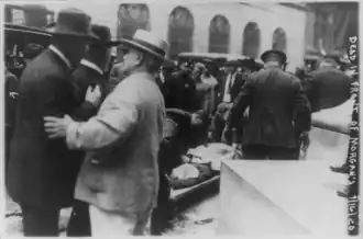 While no group took responsibility for four additional bombings in 1914, the police continued to suspect the Bresci Circle.[9] In October 1914, bombs exploded at St. Patrick's Cathedral and the priest's house at St. Alphonsus Church.[8] There were also attacks on the Bronx County Courthouse and the Tombs, a Manhattan jail.[9] The newly inaugurated New York City bomb squad[9] sent undercover detectives to infiltrate the group.[8] The plant coordinated a trap for an attempted bombing at St. Patrick's in March 1915 that involved fifty disguised officers and caught Frank Abarno and Carmine Carbone.[10][11] The anarchists and police differ in their accounts of initial meetings,[11] including Abarno and Carbone accusing the police of entrapment,[12] since the undercover agent supplied the bomb materials and laboratory.[11] Their trial revolved around La Salute è in voi and the defendants' right to read any books of any kind, including bomb-making handbooks.[13] They ultimately received sentences for six to twelve years.[12] The case rekindled fear of easily accessible bomb-making instructions and sensationalism around anarchism.[2]