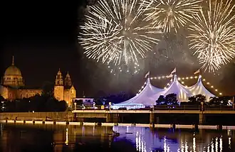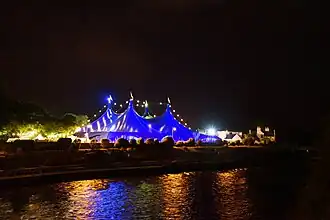 The festival takes place in Galway for two weeks in late July. It presents and produces programmes across theatre, music, visual arts, opera, street spectacle, dance, discussion, and comedy. The 2018 festival set records for attendance, breaking a quarter million for the first time, representing a 20% increase over the participants in the 2017 festival.[4] Over 600 artists created and took part in over 200 events across the festival. This 41st festival also featured a new Festival Garden in Eyre Square, offering pop-up performances and local food stands. The Festival Garden attracted more than 145,000 people. Visitors to the 2017 festival were estimated to be 45% from Galway, 18% around the rest of Ireland, and 37% outside of Ireland.[5]