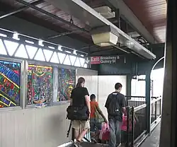 On the west end, each platform has a single staircase leading to an elevated station house beneath the tracks. It has a turnstile bank and token booth. Outside fare control, two staircases lead to both eastern corners of Quincy Street and Broadway.[8]