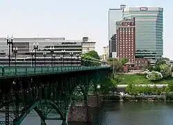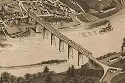 Knoxville's first permanent bridge over the Tennessee River was constructed at the south end of Gay Street in 1867, but stood for just a short time. In 1880, G. W. Saulpaw built what became known as the "Saulpaw bridge" at the site, which stood until it was replaced by the current Gay Street Bridge in 1898.[19] At the street's north end, an iron bridge was built across the Southern Railway tracks in 1876, easing pedestrian access between the north and south sides of the tracks.[4] The first Gay Street Viaduct across the tracks was built in 1919, and the current viaduct was built in 2005.[20]
