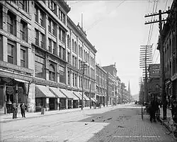 Part of Charles McClung's original 1791 plat of Knoxville, Gay Street was a focal point for the early political activity of both the city as well as the State of Tennessee.[3] By 1850, Gay Street was home to three-fourths of Knoxville's commercial activity, and in 1854, the street became Knoxville's first paved road.[4] On the eve of the Civil War, Gay Street was the site of simultaneous Union and Confederate recruiting rallies.[5] After the war, Gay Street saw extensive commercial development as railroad construction brought an industrial boom to Knoxville.[6]