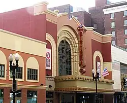 Knoxville's first major performance venue, Staub's Theatre, was built on Gay Street's 800 block in 1872, and in its early years showcased acts ranging from Payson's English Opera Troupe to vaudeville acts and wrestling matches.[4] The Bijou Theatre, constructed as an addition to the Lamar House Hotel in 1909, would witness performances by the likes of the Marx Brothers, Dizzy Gillespie, and the Ballets Russes.[11] In 1928, the Tennessee Theatre eclipsed the Bijou as Knoxville's major performance venue, and served as the city's first-run movie house until the 1950s.[11]