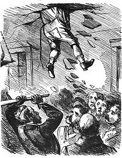 Humorist George Washington Harris, who lived on Gay Street during the mid-19th century and died at the Atkin Hotel on North Gay,[23] made one of the earliest literary references to a Gay Street institution in his 1867 short story, "Eaves-Dropping a Lodge of Free-Masons." In this story, Harris's rustic protagonist, Sut Lovingood, claims that a powerful group of Freemasons once met on the second level of the Knox County Courthouse.[24]