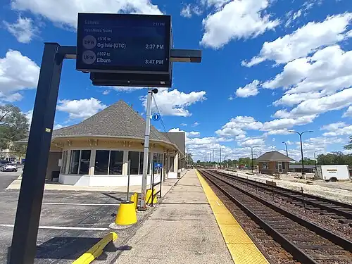 ![]() Geneva station platform; the other platform is temporarily relocated east of Third Street (May 2024) | |||||||||||||||||||||||||||||||||||||||||||||||||||||||||||||||