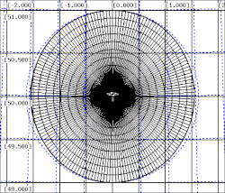 The second picture to the right shows an example radar projection with the center of projection (COP) at latitude 50.0° and longitude 0.0° which is also the radar position. The dashed lines are the equal-latitude and equal-longitude lines on top of the background map. The solid lines show equal-range and equal-azimuth with the respect to the radar position. It is a feature of the radar projection that equal-range lines are circles and equal-azimuth lines are straight lines. This is necessary to display radar video consistently with other map data when using a radar projection where the projection center has to be the radar position.