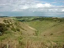 The southern side of the South Downs are deeply notched by dry valleys or coombes, which frequently end in cirques near the northern escarpment. Devil's Dyke is the most famous and remarkable of all the chalk dry valleys and is frequently cited as the type example. It is the largest single coombe anywhere in the chalk karst of Britain.[8]