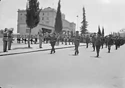 Anzac Day, Jerusalem, 25 April 1940. The march past the GOC, Lieutenant-General George Giffard, led by Generals Allen, Freyberg and Morris.