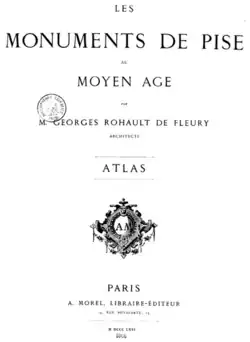 Rohault de Fleury visited Italy with his father in 1858-59, seeing Pisa, Pompeii and Naples. He published his first important monograph in 1866, Les Monuments de Pise au Moyen Age. In 1868, and again in 1869-70, he made trips to Italy. In 1874 he made his last visit to Italy with his father.[2] He exhibited in the Salons of 1863, 1864, 1867 (3rd class medal), 1870 (2nd class medal) and 1874 (1st class medal).[1]