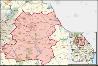 Baldwin, Barrow, Butts, Glascock, Greene, Hancock, Jasper, Jefferson, Johnson, Lincoln, McDuffie, Morgan, Oconee, Oglethorpe, Putnam, Taliaferro, Walton, Warren, Washington, and Wilkes; parts of Clarke, Columbia, Gwinnett, Henry, and Newton.