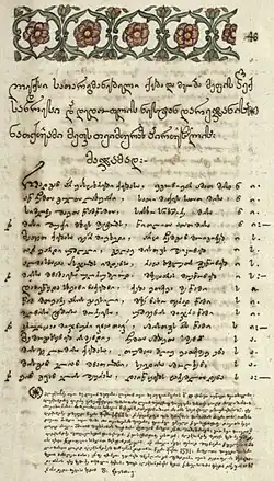 The ninth and tenth centuries witnessed a flourishing of Christian theological literature, intertwined with a growing sense of Georgian national identity. This is exemplified in Praise and Glory to the Georgian Tongue by 10th-century monk Ioane-Zosime.[1]