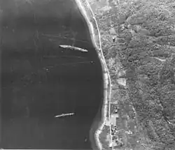 In October the first Russian troops reached the Baltic in the Battle of Memel, as part of their Baltic offensive. On 11 October Lützow, the heavy cruiser Prinz Eugen, the destroyers Z25, Z35 and Z36, and the torpedo boats T13, T16, T20 and T21[96] bombarded Memel in support of the German defense of the port. Lützow hit twenty targets with four hundred 28 cm and two hundred and forty-five 15 cm shells while Prinz Eugen fired six hundred and seventy-three 20 cm shells. Three days later the operation was repeated. Returning from the operation, Prinz Eugen collided with Leipzig and had to be repaired so only Lützow was available for a third operation on 22 October. During the Memel operations, the Ar 196 from Lützow and the two Ar 196 from Prinz Eugen were operated from the seaplane tender Hans Albricht Wedel. The three Ar 196s were continuously in the air and it was too risky for the cruisers to stop to recover the floatplanes, since Russian submarines were operating in the area. The Ar 196s were used for artillery direction, spotting the fall of shot, anti-submarine patrol and even engaged Russian fighters and bombers.[97] The Russians had also executed landings on the strategically important Baltic Island Ösel. The German army was retreating towards the peninsula of Sworbe on the island. On 23 and 24 October, Lützow bombarded Russian positions at Sworbe and thwarted the final Russian attack.[98] The defenders held their bridgehead but one month later the Russians renewed their attacks. Lützow was called in again on 23 November but the German army evacuated the same day.[99][99]