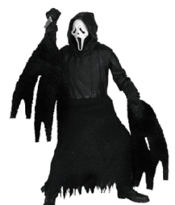 McFarlane Toys produced a 6-inch figurine of Ghostface in 1999 for the "Movie Maniacs II" series of horror and science fiction inspired line of character models.[38] A series of figures were produced by NECA for Scream 4 featuring the standard mask and black cowl plus variations such as "Zombie Ghostface" with a decayed appearance on the mask and "Scarecrow Ghostface" with brown, burlap material used for the mask and clothing.[39]