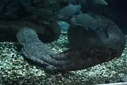 Cryptobranchids are large and predominantly nocturnal salamanders that can reach a length of 1.8 m (5.9 ft), though most are considerably smaller today.[1] Despite being aquatic, they are poor swimmers and mostly just walk on the bottom. Swimming by undulatory locomotion is generally used just for short distance-escapes to hiding places. The body is stout with large folds of skin along the flanks and a heavy, laterally compressed tail. These folds help increase the animals' surface area, allowing them to absorb more oxygen from the water as the adults lacks gills and have poorly developed lungs. Like in the majority of salamander species, there are four toes on the fore limbs and five on the hind limbs. They have paedomorphic traits, meaning their metamorphosis from the larval stage is incomplete, so they lack eyelids and the adults retain gill slits (open in the hellbender, closed in Andrias). Eyes are small and the eyesight bad.[8]