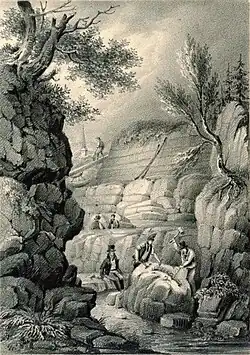 Sketch of Tilgate Quarry with Gideon Mantell overseeing the uncovering of fossils