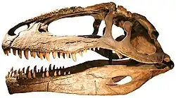 Though incompletely known, the skull of Giganotosaurus appears to have been low. The maxilla of the upper jaw had a 92 cm (36 in) long tooth row, was deep from top to bottom, and its upper and lower edges were almost parallel. The maxilla had a pronounced process (projection) under the nostril, and a small, ellipse-shaped fenestra (opening), as in Allosaurus and Tyrannosaurus. The nasal bone was very rugose (rough and wrinkled), and these rugosities continued backwards, covering the entire upper surface of this bone. The lacrimal bone in front of the eye had a prominent, rugose crest (or horn) that pointed up at a backwards angle. The crest was ridge-like, and had deep grooves. The postorbital bone behind the eye had a down and backwards directed jugal process that projected into the orbit (eye opening), as seen in Tyrannosaurus, Abelisaurus, and Carnotaurus. The supraorbital bone above the eye that contacted between the lacrimal and postorbital bones was eave-like, and similar to that of Abelisaurus. The quadrate bone at the back of the skull was 44 cm (17 in) long, and had two pneumatic (air-filled) foramina (holes) on the inner side.[1][19]