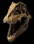 In 1996, the paleontologist Paul Sereno and colleagues described a new skull of the related genus Carcharodontosaurus from Morocco, a theropod described in 1927 but previously known only from fragmentary remains. They estimated the skull to have been 1.60 m (5 ft) long, similar to Giganotosaurus, but perhaps exceeding that of the Tyrannosaurus "Sue", with a 1.53 m (5 ft) long skull. They also pointed out that carcharodontosaurs appear to have had the proportionally largest skulls, but that Tyrannosaurus appears to have had longer hind limbs.[9] In an interview for a 1995 article entitled "new beast usurps T. rex as king carnivore", Sereno noted that these newly discovered theropods from South America and Africa competed with Tyrannosaurus as the largest predators, and would help in the understanding of Late Cretaceous dinosaur faunas, which had otherwise been very "North America-centric".[10] In the same issue of the journal in which Carcharodontosaurus was described, the paleontologist Philip J. Currie cautioned that it was yet to be determined which of the two animals were larger, and that the size of an animal is less interesting to paleontologists than, for example, adaptations, relationships, and distribution. He also found it remarkable that the two animals were found within a year of each other, and were closely related, in spite of being found on different continents.[11]