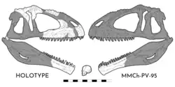 In a 1997 interview, Coria estimated Giganotosaurus to have been 13.7 (45 ft) to 14.3 (47 ft) m long and weighing 8 to 10 t (8.8 to 11.0 short tons) based on new material, larger than Carcharodontosaurus. Sereno countered that it would be difficult to determine a size range for a species based on few, incomplete specimens, and both paleontologists agreed that other aspects of these dinosaurs were more important than settling the "size contest".[12] In 1998, the paleontologist Jorge O. Calvo and Coria assigned a partial left dentary bone (part of the lower jaw) containing some teeth (MUCPv-95) to Giganotosaurus. It had been collected by Calvo near Los Candeleros in 1988 (found in 1987), who described it briefly in 1989, while noting it may have belonged to a new theropod taxon. Calvo and Coria found the dentary to be identical to that of the holotype, though 8% larger at 62 cm (24 in). Though the rear part of it is incomplete, they proposed that the skull of the holotype specimen would have been 1.80 m (6 ft) long, and estimated the skull of the larger specimen to have been 1.95 m (6.4 ft) long, the longest skull of any theropod.[13][14][15]