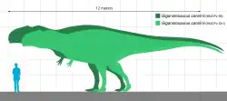 Giganotosaurus is thought to have been one of the largest theropod dinosaurs, but the incompleteness of its remains have made it difficult to estimate its size reliably. It is therefore impossible to determine with certainty whether it was larger than Tyrannosaurus, for example, which has been considered the largest theropod historically. Different size estimates have been reached by several researchers, based on various methods, and depending on how the missing parts of the skeleton have been reconstructed. Length estimates for the holotype specimen have varied between 12 and 13 m (39 and 43 ft), with a skull between 1.53 and 1.80 m (5.0 and 5.9 ft) long, a femur (thigh bone) between 1.365 and 1.43 m (4.48 and 4.69 ft) long, and a weight between 4.2 and 13.8 t (4.6 and 15.2 short tons).[6][1][13][20] Fusion of sutures (joints) in the braincase indicates the holotype specimen was a mature individual.[6] A second specimen, consisting of a dentary bone from a supposedly larger individual, has been used to extrapolate a length of 13.2 m (43 ft), a skull 1.95 m (6.4 ft) long, and a weight of 8.2 t (9.0 short tons). Some writers have considered the largest size estimates for both specimens exaggerated.[13][31][23][22] Giganotosaurus has been compared to an oversized version of the well-known genus Allosaurus.[10]