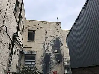 Girl with a Pierced Eardrum is at the end of a small alley on a building in Albion Dockyard in Hanover Place, Bristol.[6] It is stencilled graffiti and depicts an enlarged version of part of Girl with a Pearl Earring, a c. 1665 oil-on-canvas painting by Johannes Vermeer. It is on a wall, positioned so that an existing yellow security alarm replaces the pearl earring.[7]