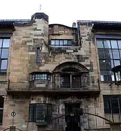 The school is housed in a number of buildings around Renfrew Street in the centre of Glasgow, upon Garnethill, an area first developed by William Harley of Blythswood Hill in the early 1800s. The most famous of its buildings was designed by Charles Rennie Mackintosh in phases between 1896 and 1909. The eponymous Mackintosh Building soon became one of the city's iconic landmarks, of international fame. It is a pioneer of the Modern Style (British Art Nouveau style). The building was severely damaged by fire in May 2014 and destroyed by a second fire in June 2018, with only the burnt-out shell remaining.[2] Plans are in place for its rebuilding in accordance with Charles Rennie Mackintosh's style and content.