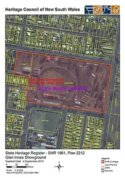 Glen Innes Showground is of state heritage significance as an outstanding, picturesque and stylistically cohesive and complementary suite of showground buildings sited in a park like landscape setting. Most of the buildings date from the 1890s and 1920s and are all architect-designed by Sydney-based or local and regional architects.[1]