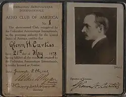 1. ^ Curtiss was awarded French pilot's license No. 2 as a tribute to his Gordon Bennett Cup victory.[21] Blériot held No. 1 and Leon Delagrange No. 3, as the first 16 certificates of the Aero Club de France were retrospectively numbered on December 4, 1909, in alphabetical order.[22]