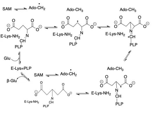 2. ^ a b c Ruzicka FJ, Frey PA (February 2007). "Glutamate 2,3-aminomutase: a new member of the radical SAM superfamily of enzymes". Biochimica et Biophysica Acta (BBA) - Proteins and Proteomics. 1774 (2): 286–96. doi:10.1016/j.bbapap.2006.11.008. PMC 1945111. PMID 17222594.