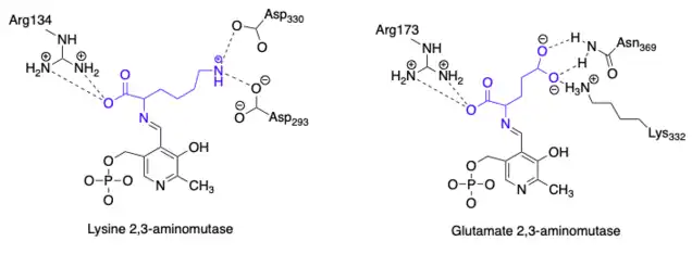 By comparing the amino acid sequences of a closely related enzyme to glutamate 2,3-aminomutase, lysine 2,3-aminomutase, researchers were able to identify key catalytic residues in glutamate 2,3-aminomutase that are distinguishing from similar aminomutases. In the case of lysine 2,3-aminomutase, lysine is bound to the enzyme in the active state, whereas glutamate 2,3-aminomutase has glutamate bound in the active state. Both enzymes appear to bind α-carboxylate groups on their respective amino acid substrates in a similar manner using arginine residues at positions 134 (lysine 2,3 aminomutase) and 173 (glutamate 2,3-aminomutase). However, the binding of the amino acid side chains differs because lysine confers basic properties where as glutamate confers acidic properties. The proposed identifying residues of a glutamate 2,3-aminomutase are Lys332 and Asn369 which likely bind the γ–carboxylate group of glutamate. This is the key difference from lysine 2,3-aminomutase because that enzyme uses Asp293 and Asp330 to bind the ε–aminium group of lysine. The proposed differences lead to a unique hydrogen bonding pattern to further distinguish glutamate 2,3-aminomutases from lysine 2,3-aminomutases which is shown here:[2]