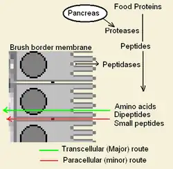 In the normal gut, proteins are digested to peptides by pepsin (stomach), trypsin and chymotrypsin (derived from the pancreas and activated in the gut). Peptides are further digested when they approach the villi, where brush border peptidases break proteins into amino acids. Over much of the small intestine only small solutes, like water, can cross the tight junctions, however, in some regions of the intestine peptides as large as 500 daltons (4 amino-acids residues in length) can cross.[1]