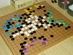 In Multi-player Go, stones of different colors are used so that three or more players can play together. The rules must be somewhat altered to create balance in power, as those who play first (especially the first four, on a four-cornered board) have significant advantage.[13]