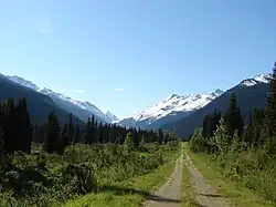 View from the Goat – Milk River Forest Service Road towards the pass at the headwaters of the Milk River in the Cariboo Mountains