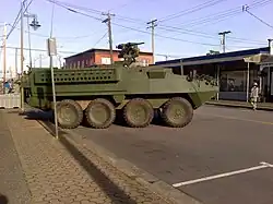 A wooden mock-up of a U.S. Army Stryker armoured fighting vehicle parked on Moncton St. in Richmond, BC during the shooting of Godzilla