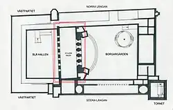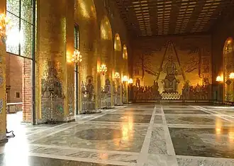 The Golden Hall (Swedish: Gyllene salen) is a banqueting hall in Stockholm City Hall. Measuring 44-metre (144 ft) in length, it received its name when its walls were decorated by mosaics created by the artist Einar Forseth on a proposal by the City Hall architect Ragnar Östberg.[1] The hall is best known as the location of the ball after the annual Nobel Banquet in the City Hall's Blue Hall.[2]