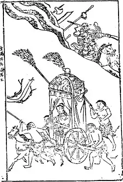 Gonggong is known from the late Warring States period (before 221 BC). Gonggong appears in the ancient "Heavenly Questions" (Tianwen) poem of the Chu Ci, where he is blamed for knocking the Earth's axis off center, causing it to tilt to the southeast and the sky to tilt to the northwest.[2] This axial tilt is used to explain why the rivers of China generally flow to the southeast, especially the Yangzi River and the Yellow River, and why the Sun, Moon, and stars move towards the northwest. Literature from the Han dynasty becomes much more detailed regarding Gonggong.