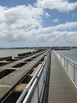 The Tauwitchere Barrage connects Tauwitchere Island with Pelican Point on the mainland. The lock in this barrage, provided for fishing boats, measures 13.7 m by 3.8 m.[2]